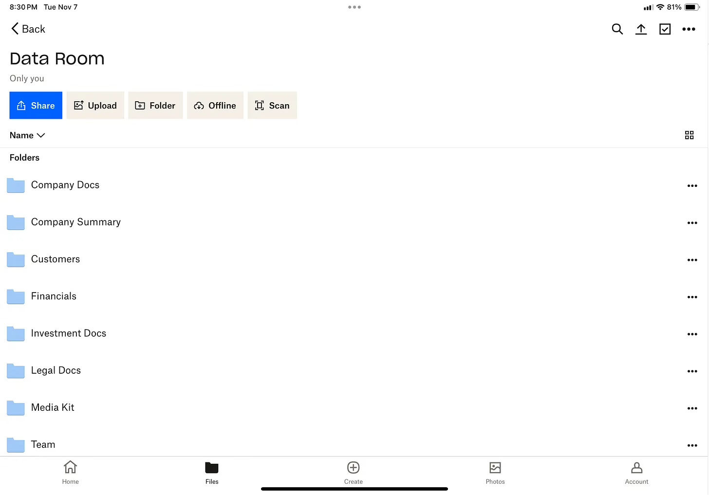 Here is a pretty exhaustive example of what a “Data Room” might look like, depending on your structure, growth, and exit strategy:
